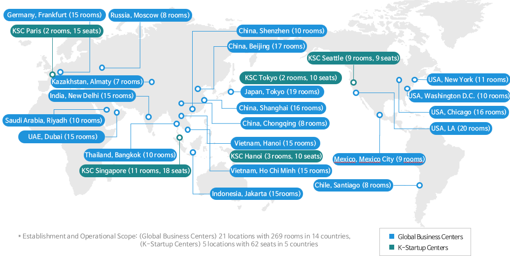 KOSME operates 21 Global Business Center (GBC) offices in 14 countries and 5 K-Startup Center (KSC) offices in 5 countries.